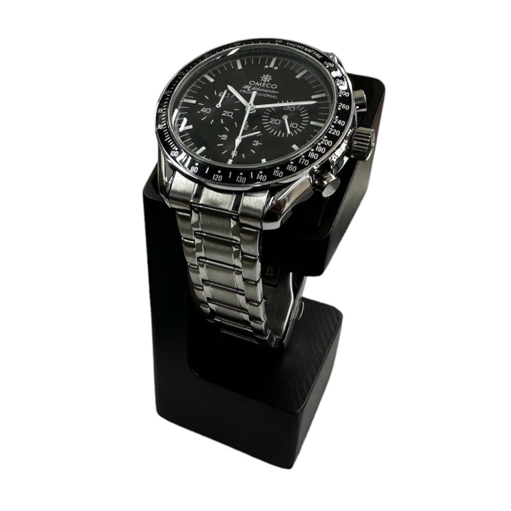 ブラックを基調としたシンプルなフォルムが、腕時計の美しさを引き立てます。余計な装飾を一切排除し、静かに主役を支えるデザインは、インテリアの一部としても自然に溶け込みます。スタイリッシュな佇まいが、日常を上質に彩ります。