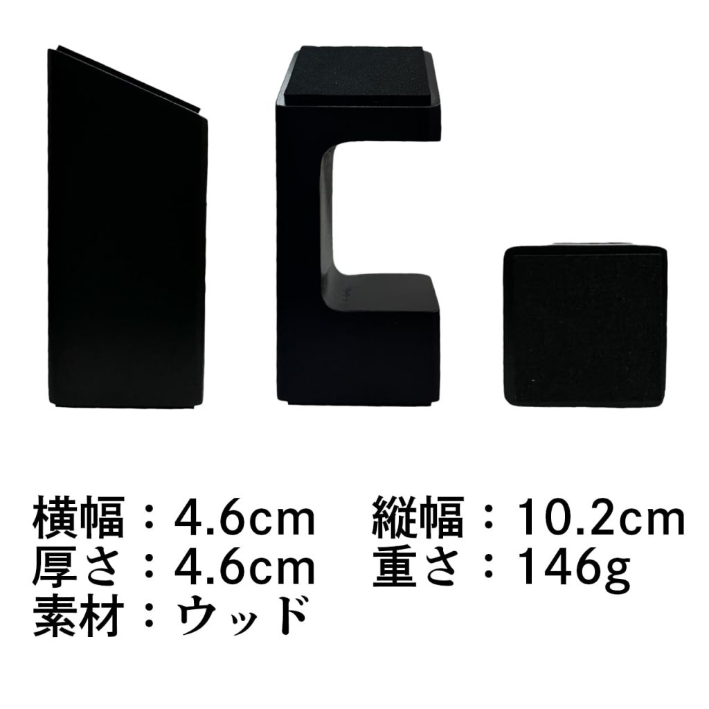 幅4.6cm×高さ10.2cm×奥行4.6cmというコンパクトなサイズ感で、どんな空間にも自然に収まります。重量は146g、素材にはウッドを使用。軽量でありながら安定感も兼ね備え、腕時計を安心してディスプレイできる仕様です。