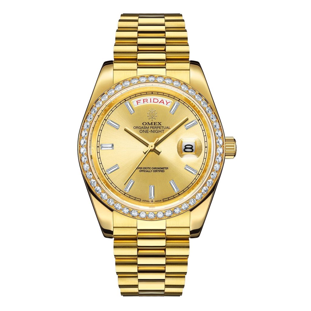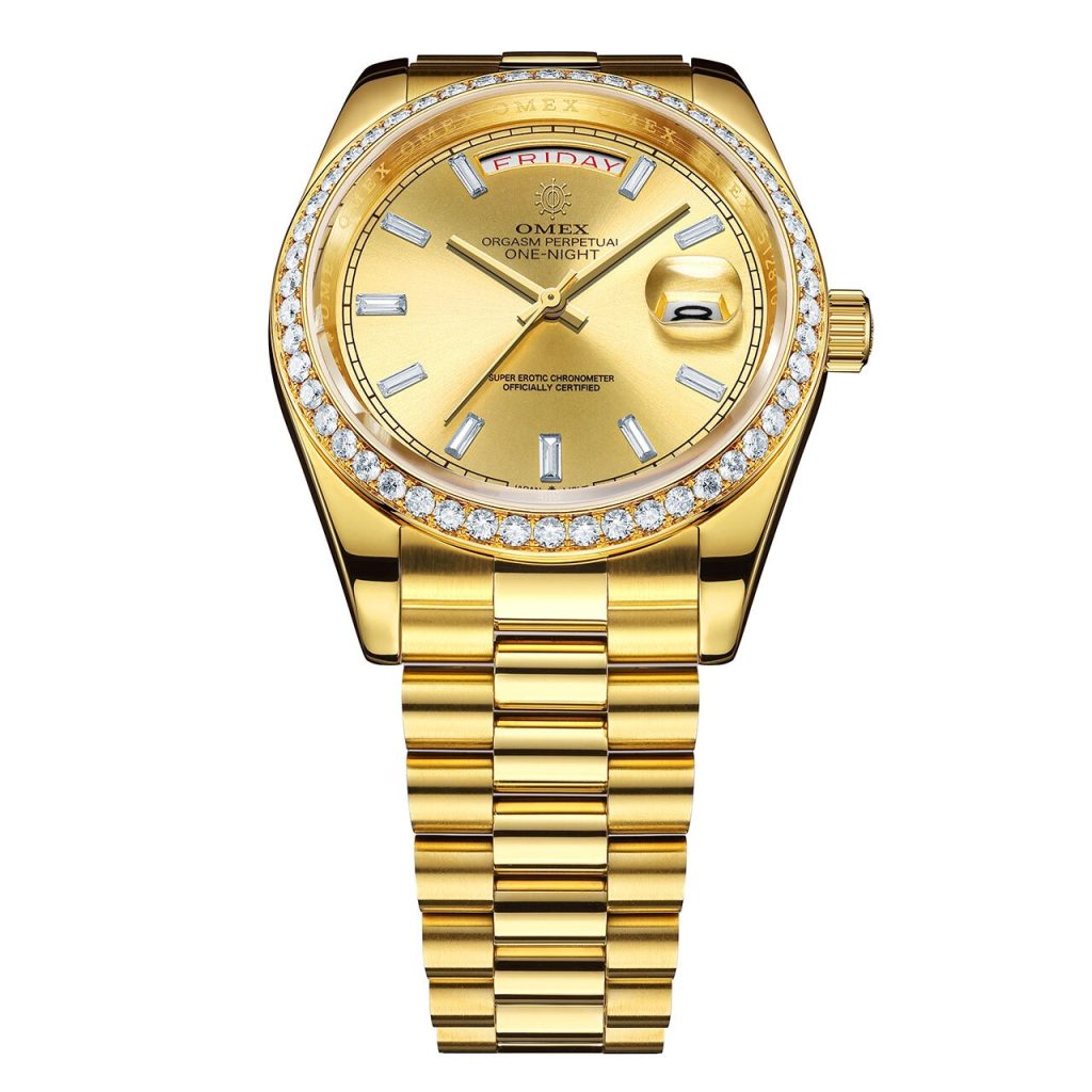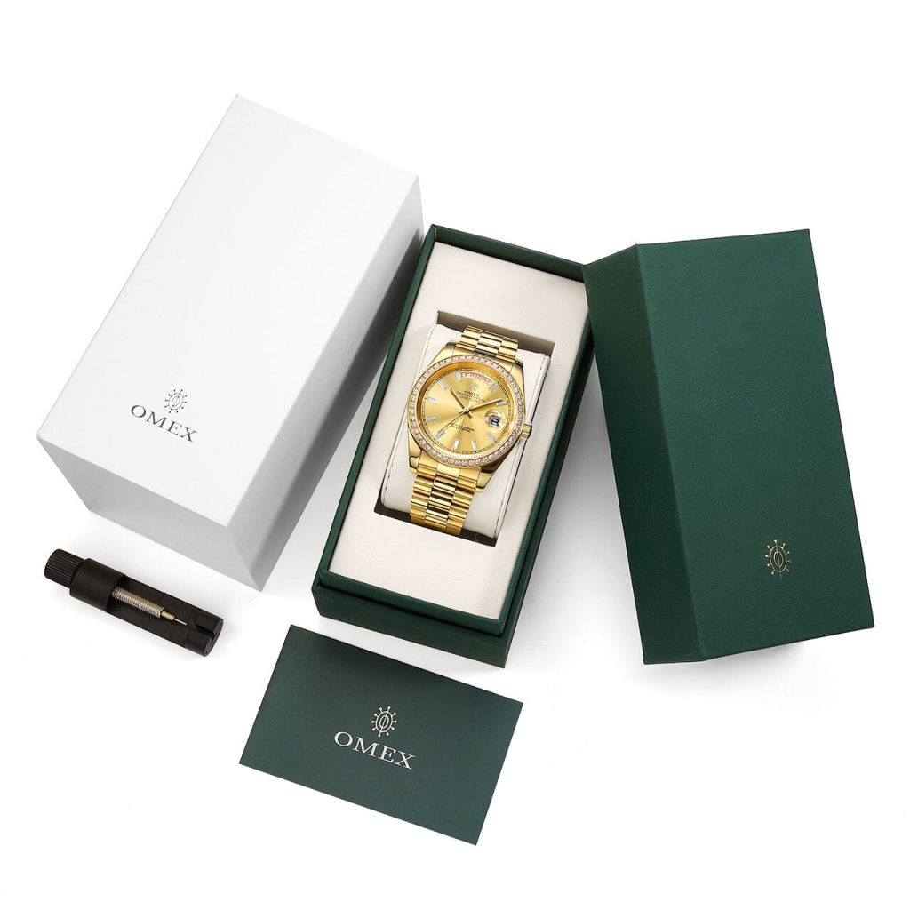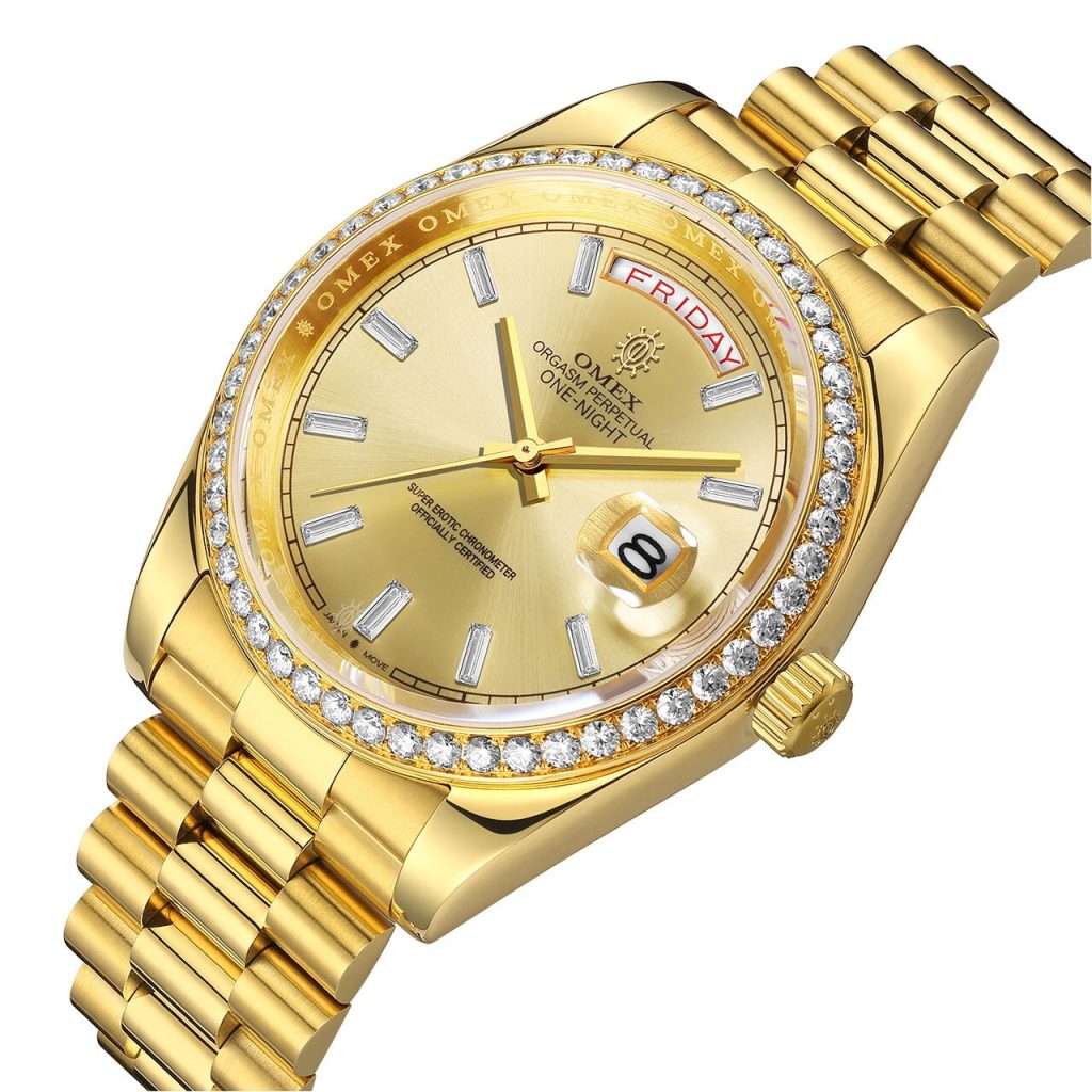 腕に乗せた瞬間、他のどの時計にもない重厚な満足感が伝わる。光の下で輝きを変えるゴールドの輝度、そしてモアサナイトの煌めきが織りなすコントラストは圧巻。OMEXが誇る最高級のクラフトマンシップが生み出すこの一本は、単なるアクセサリーではなく“人生を飾る芸術品”。贅沢を知る男のための最終解答です。