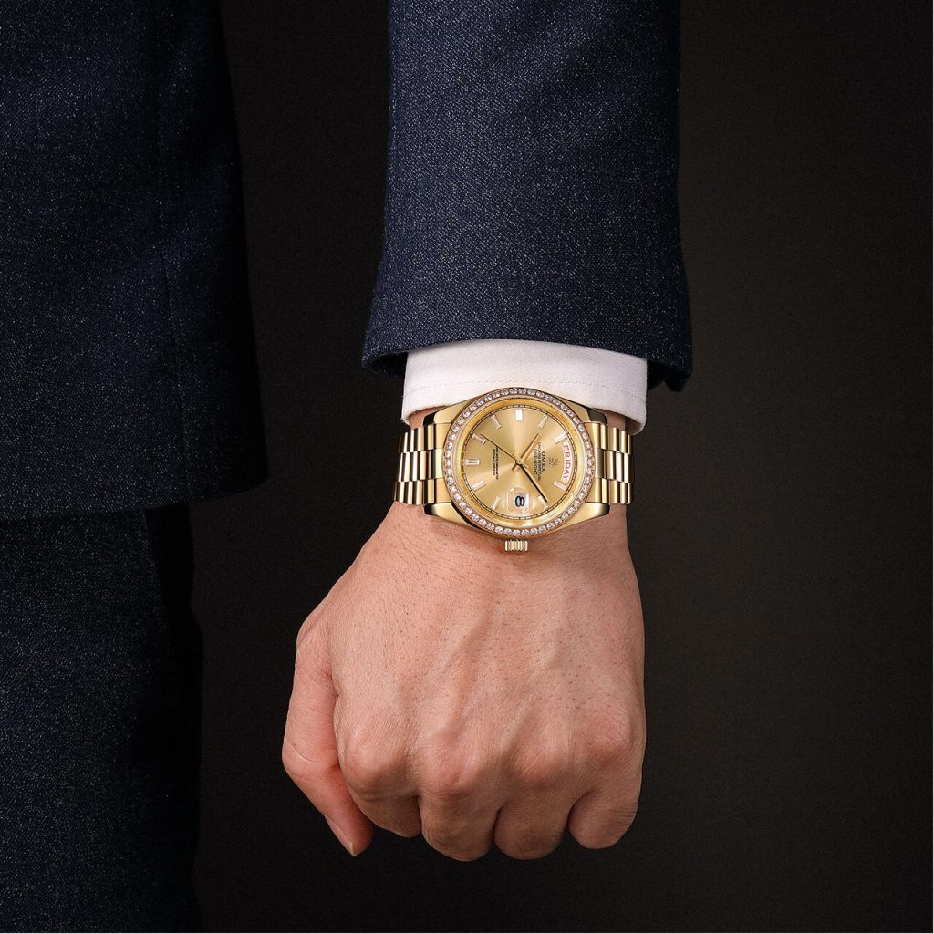 まばゆい光を放つゴールドトーンが、手元に宿る瞬間から視線を奪う。華美でありながらも、計算された上品さを纏い、ひと目で高級感を放つ一本。装飾ではなく“地位”としての輝きを宿すこの時計は、まさに特別な夜を演出するための相棒。どんな装いにも存在感を与える、圧倒的なラグジュアリーの象徴です。