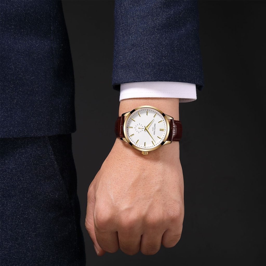 普段使いに最適な実用性を備えつつ、ひと目で印象に残る存在感を放ちます。オフィスでのビジネススタイルはもちろん、休日のカジュアルなコーデにも対応可能。シンプルな文字盤にゴールドの輝きが加わることで、毎日の着こなしに小さな高級感を添え、気分を上げてくれる相棒のような一本です。