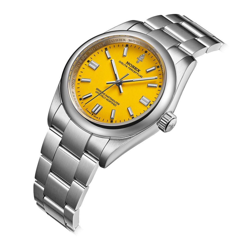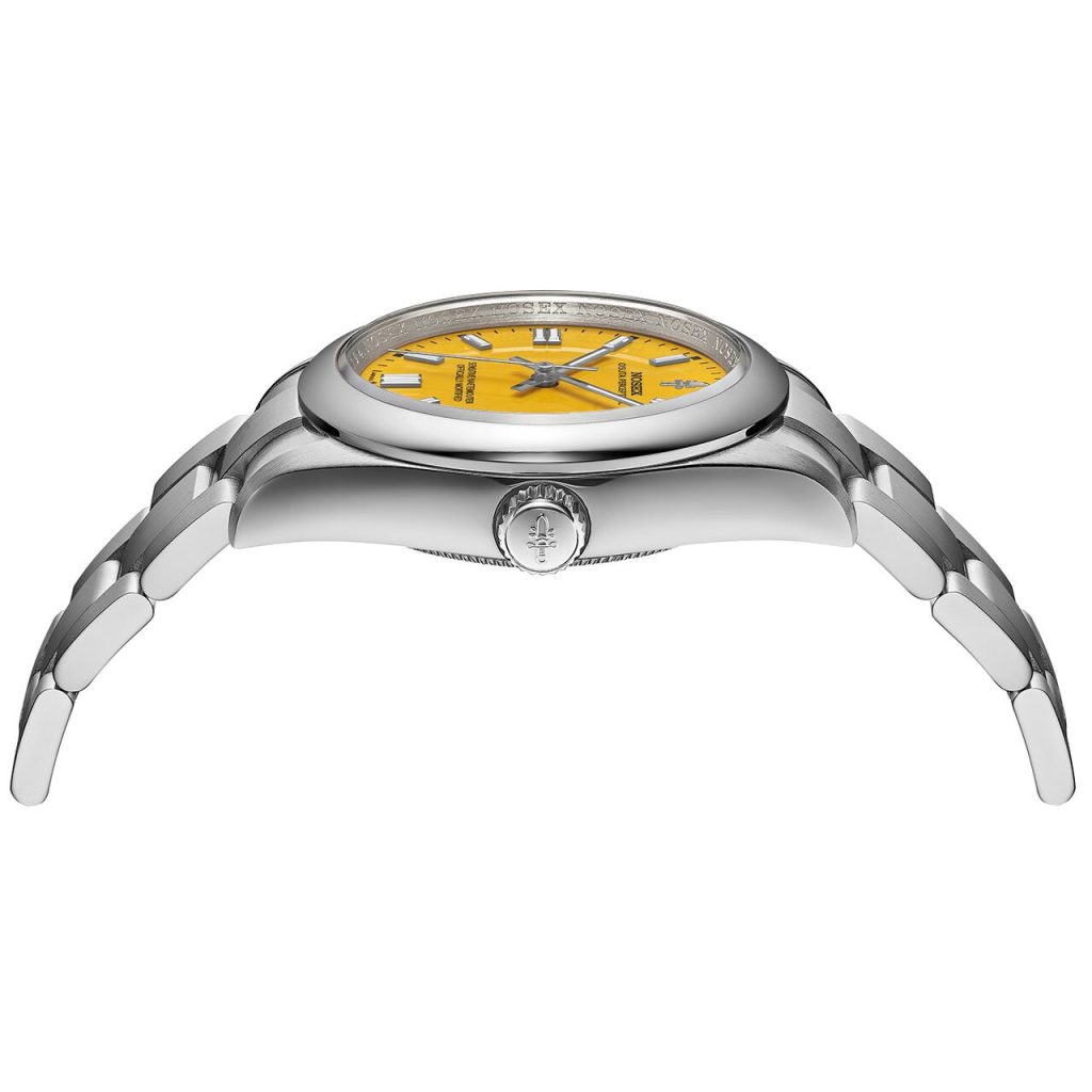光沢のあるヘアライン仕上げは、イエローダイヤルの鮮やかさを引き立て、