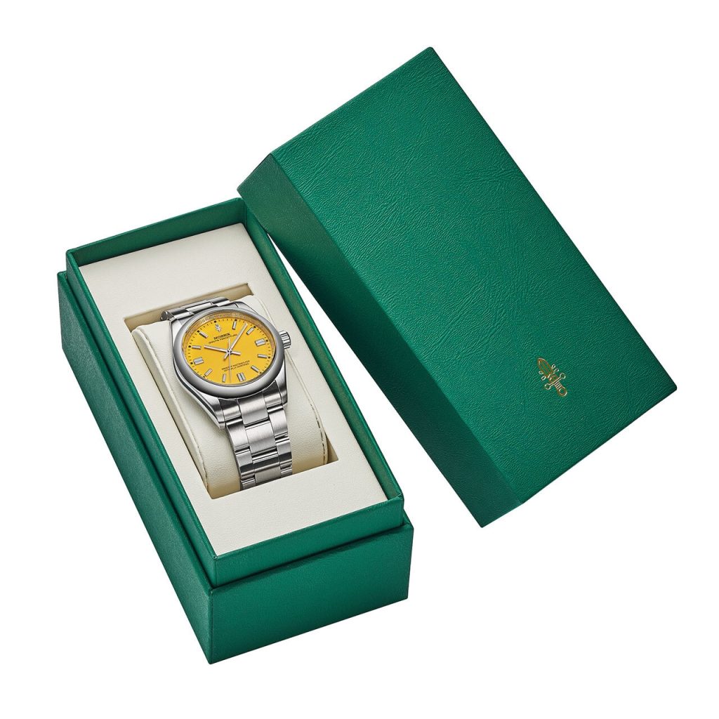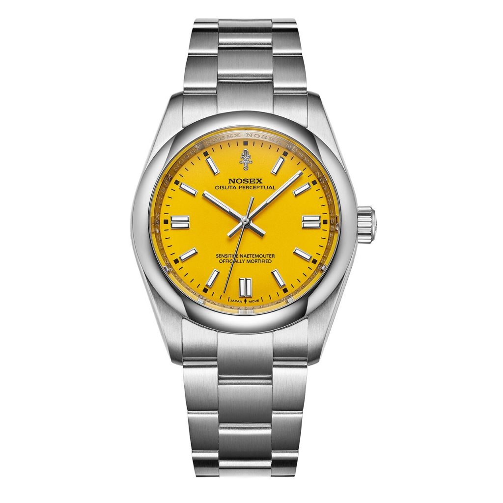 「いいエロー」という名の通り、鮮烈な黄色が印象的なダイヤルは、見る者にポジティブなエネルギーを与えます。