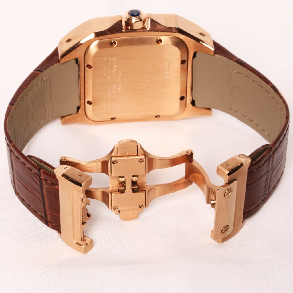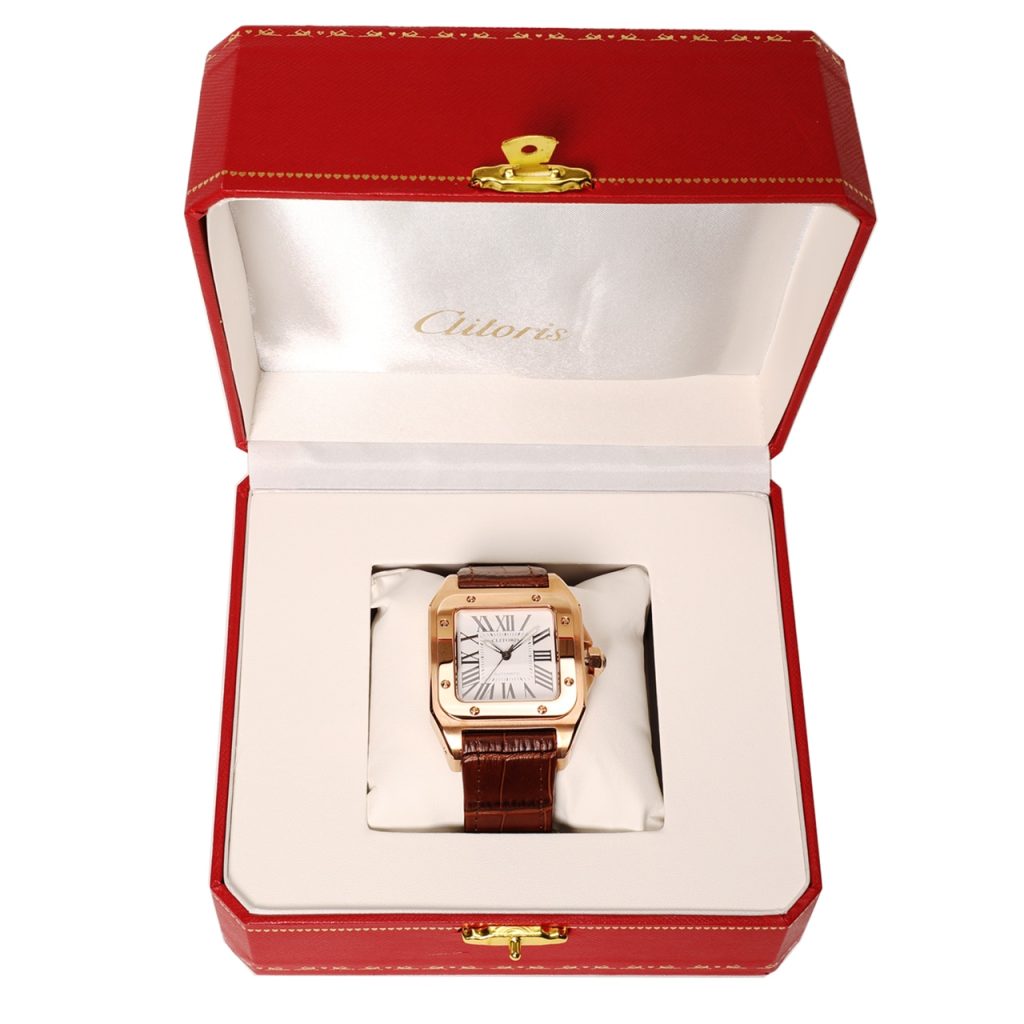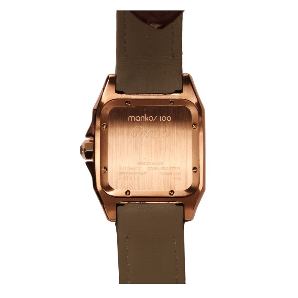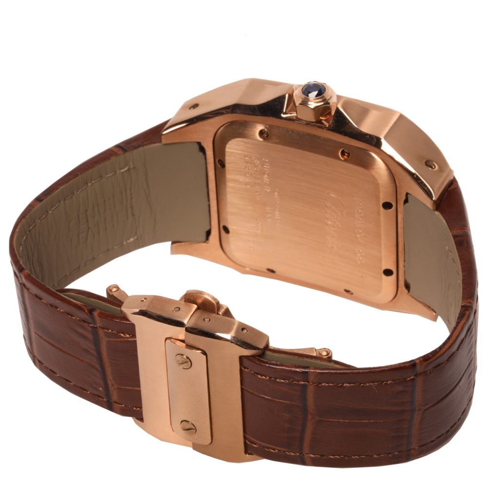 力強いスクエアケースに、気品漂うピンクゴールドカラーを組み合わせた印象的な一本。ローマ数字を配した文字盤がクラシカルな雰囲気を演出し、現代的なフォルムとの絶妙なバランスを生み出している。手元に確かな個性と高級感をもたらすデザインだ。