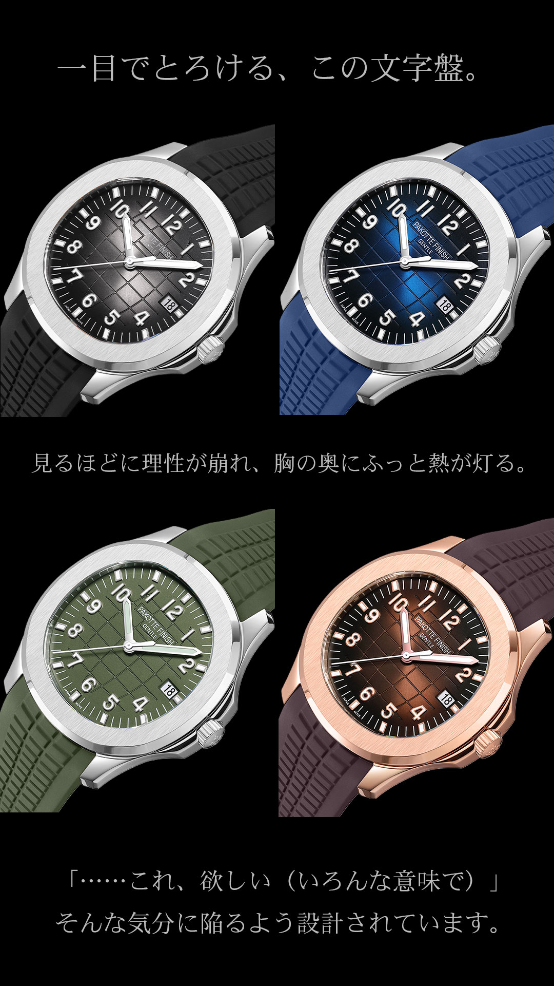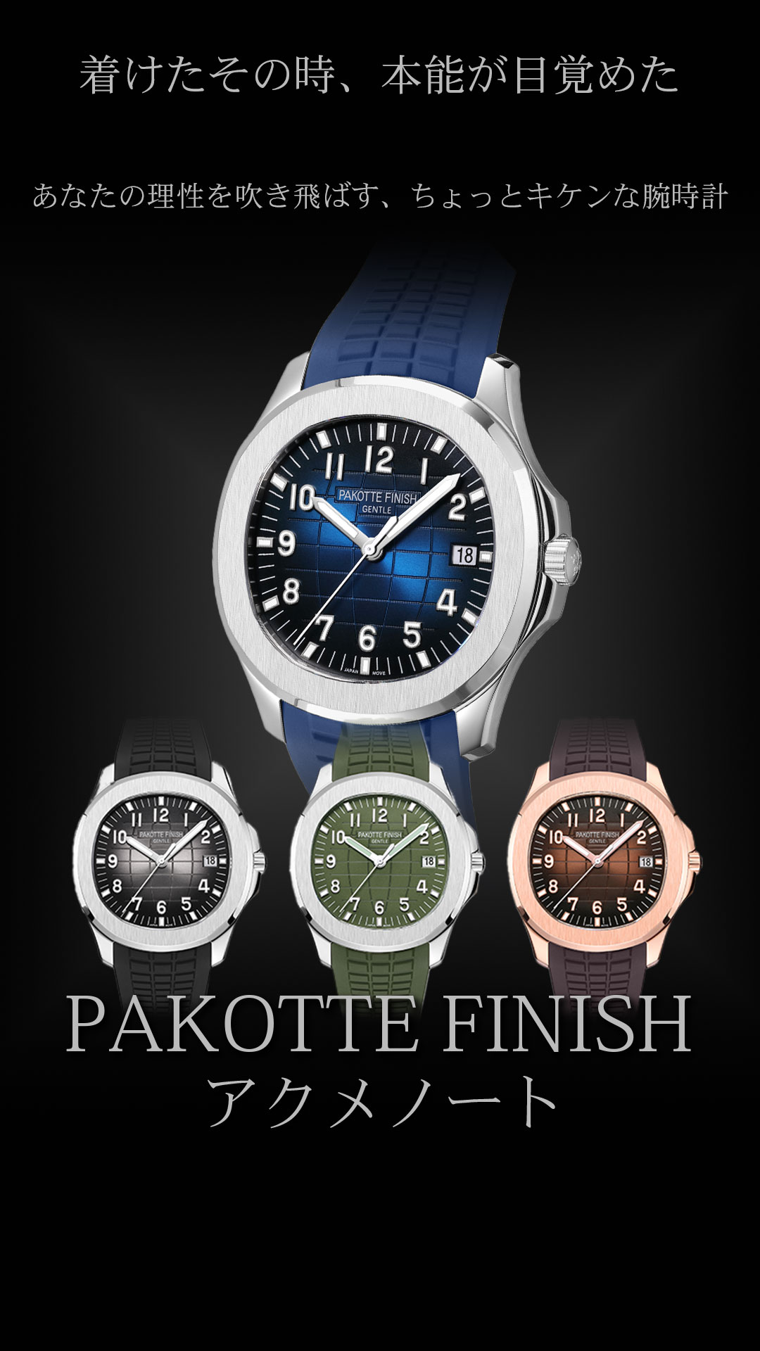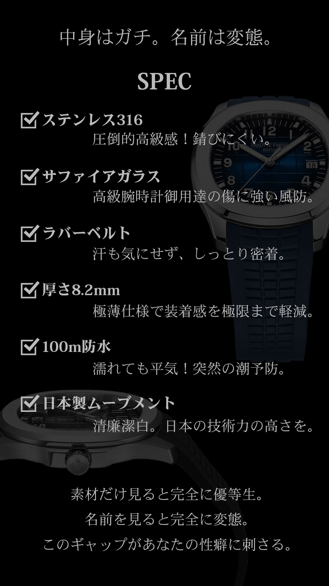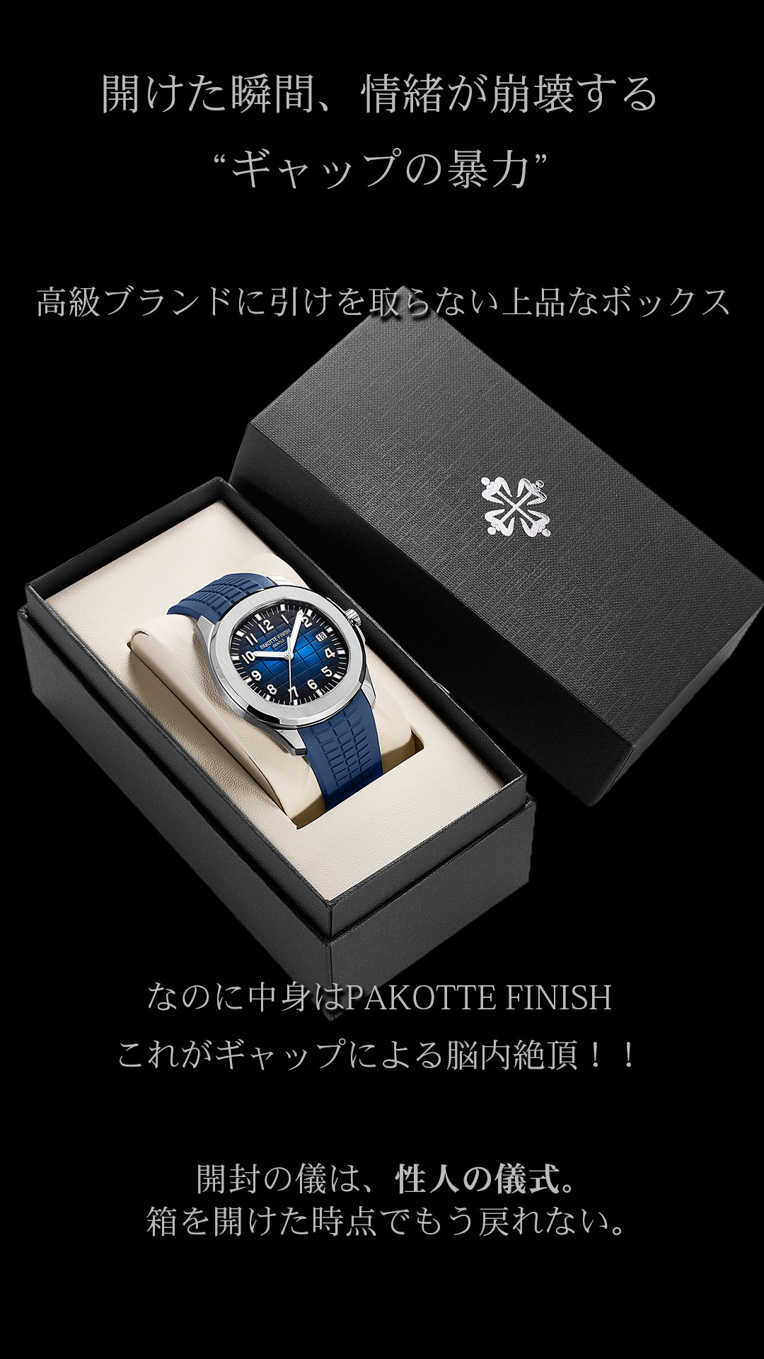 PAKOTTE FINISH アクメノート ──ヌける精度、刻む余韻。 時は流れない。 ただ、あなたの“手首”で脈打つ。 ステンレス316。 医療器具にも使われる素材。 清潔で錆びに強い―― だが夜には、汗と欲にまみれる覚悟がある。 サファイアガラス。 その透明さは、まるで理性のラストライン。 光が差し込むたび、 心の奥のムラムラが反射する。 厚み8.2mm。 薄い、だが存在感は濃い。 袖口に忍びこみ、 静かに主導権を奪うタイプ。 10気圧防水。 どんなプレイでも、ビショビショでも大丈夫。 愛も汗も、受け止める防水設計。 風呂でも、シャワーでも、ベッドでも。 止まらないのは、あなただけ。 ムーブメントはVJ52(日本製)。 中は日本の職人魂。 外は完全にヤってる顔。 このギャップが、一番ヌける。 PAKOTTE FINISH アクメノート。 それは時計というより、 時間をイかせる道具。 触れた瞬間、 あなたの中の“時”が、 ビクッと動き出す。 |