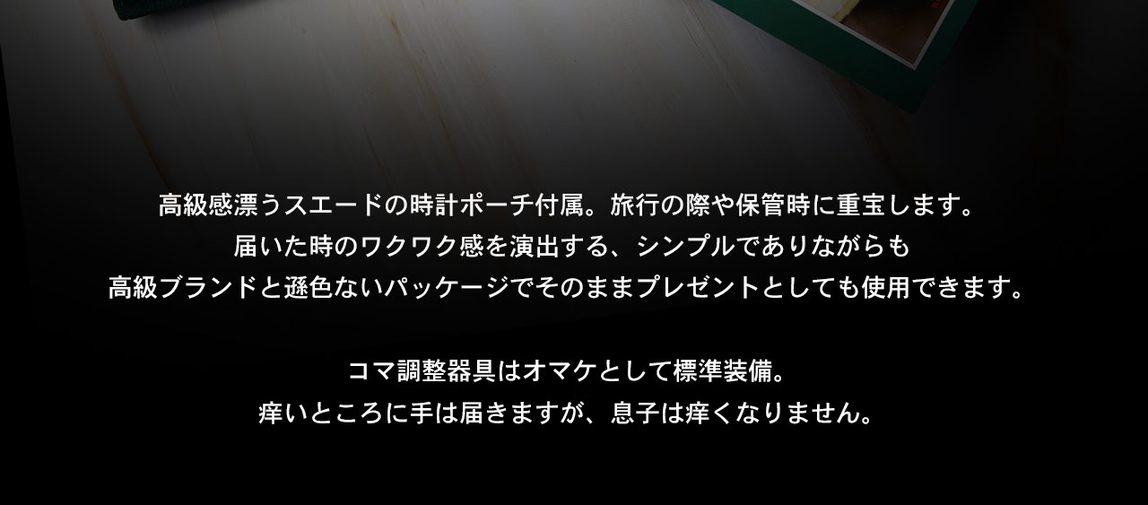 | 付属品 | 専用BOX / 取扱説明書 / 保証書 / コマ調整器具(保証対象外・破損時交換不可) ※コマ調整器具はオマケのため、保証は行っておりませんのでご了承下さい。 ※ご自身でのコマ調整が不安な方は、時計専門店でご対応下さい。 |